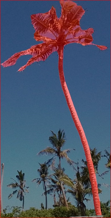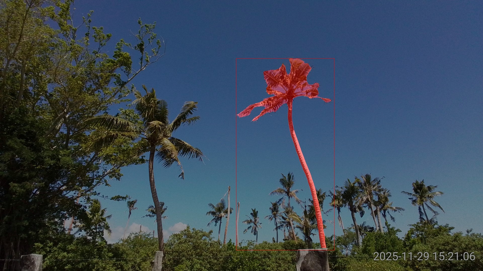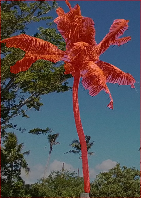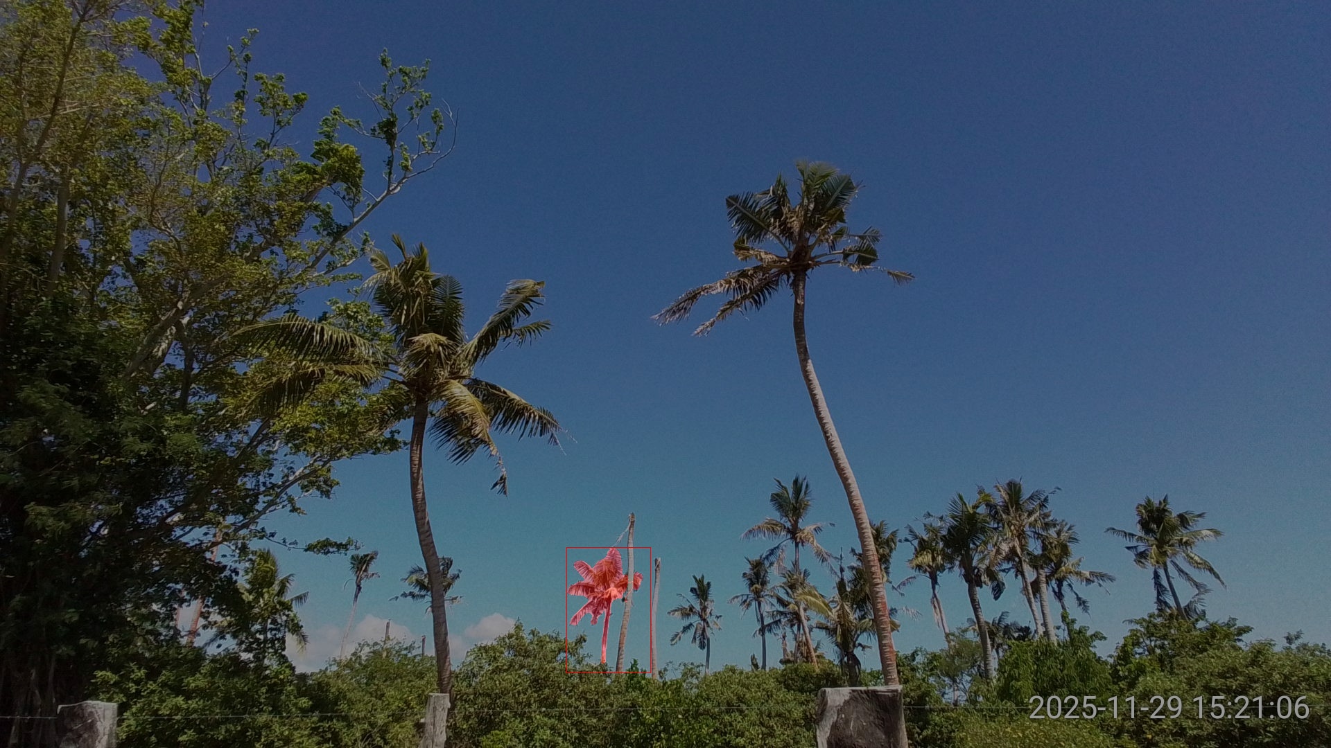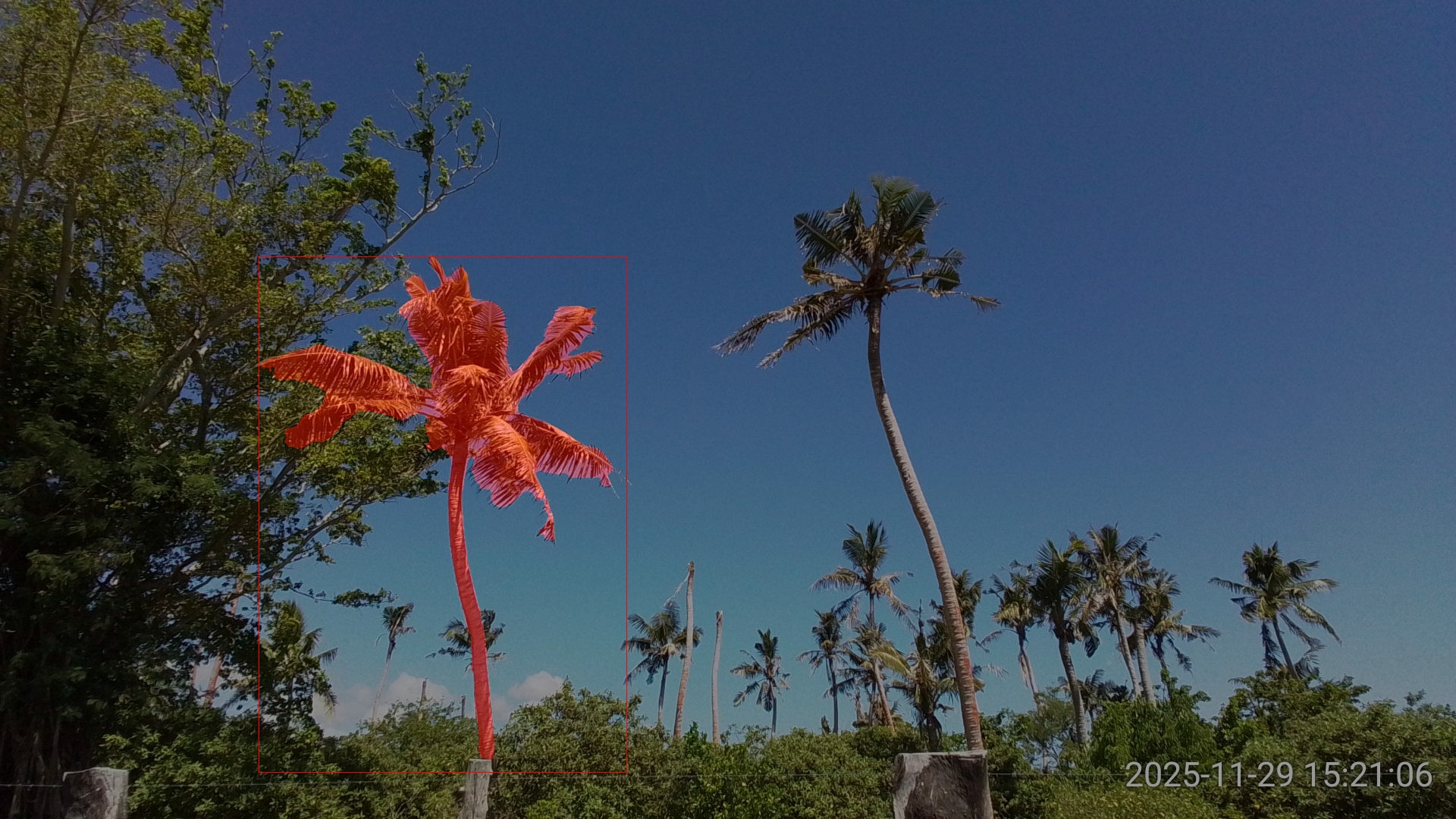 SAM3 performed very well on this image, returning high confidence detections and precise segmentation even tough the two coconut palms were heavily damaged (Figure 3).