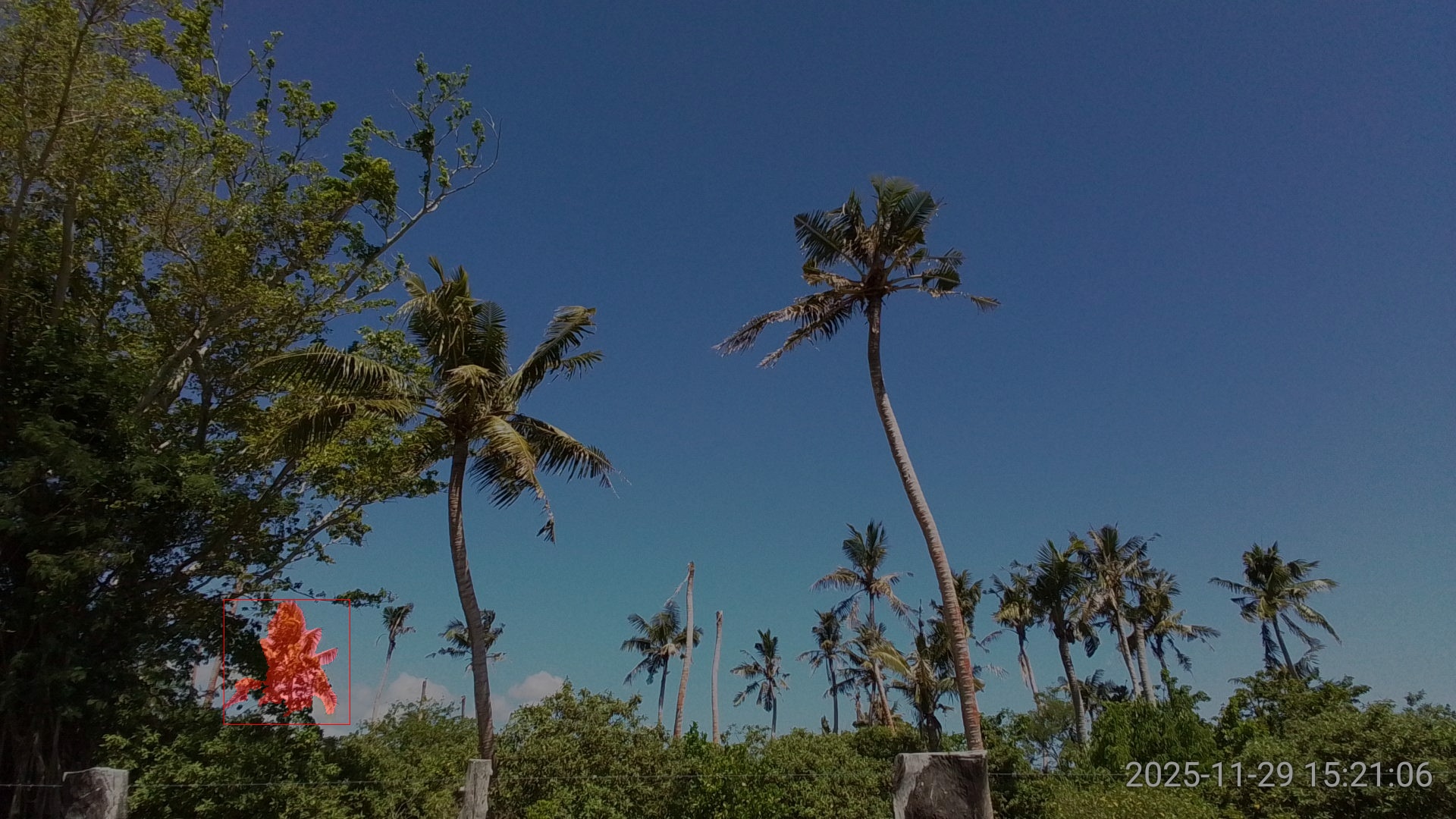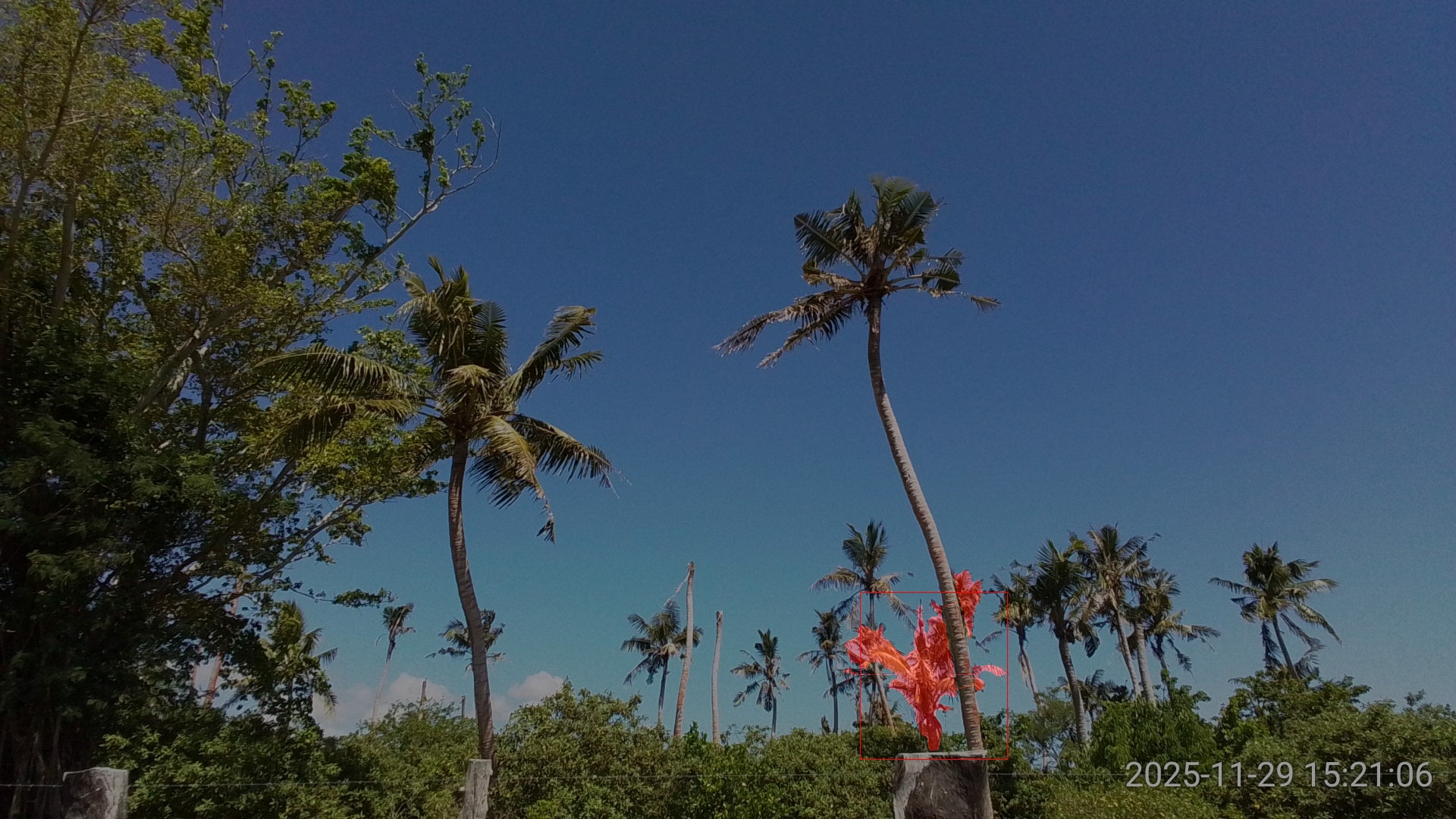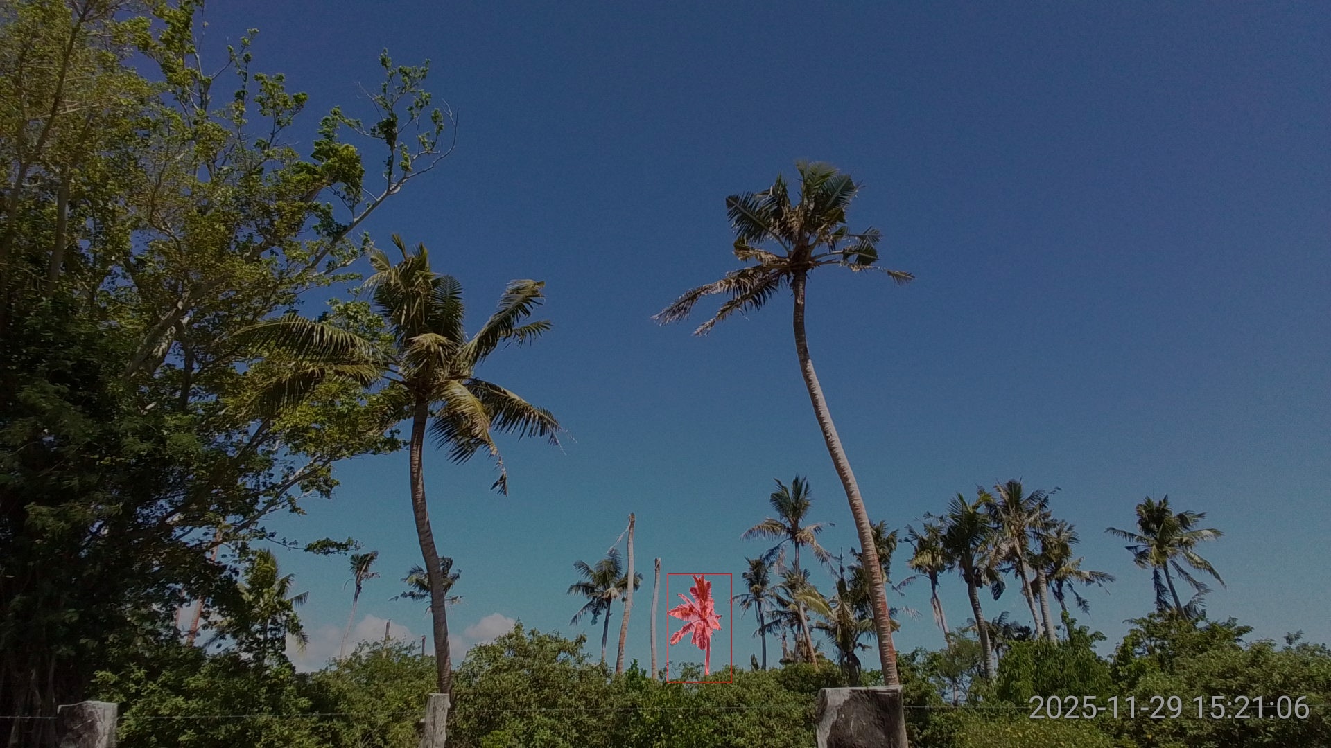 SAM3 performed very well on this image, returning high confidence detections and precise segmentation even tough the two coconut palms were heavily damaged (Figure 3).