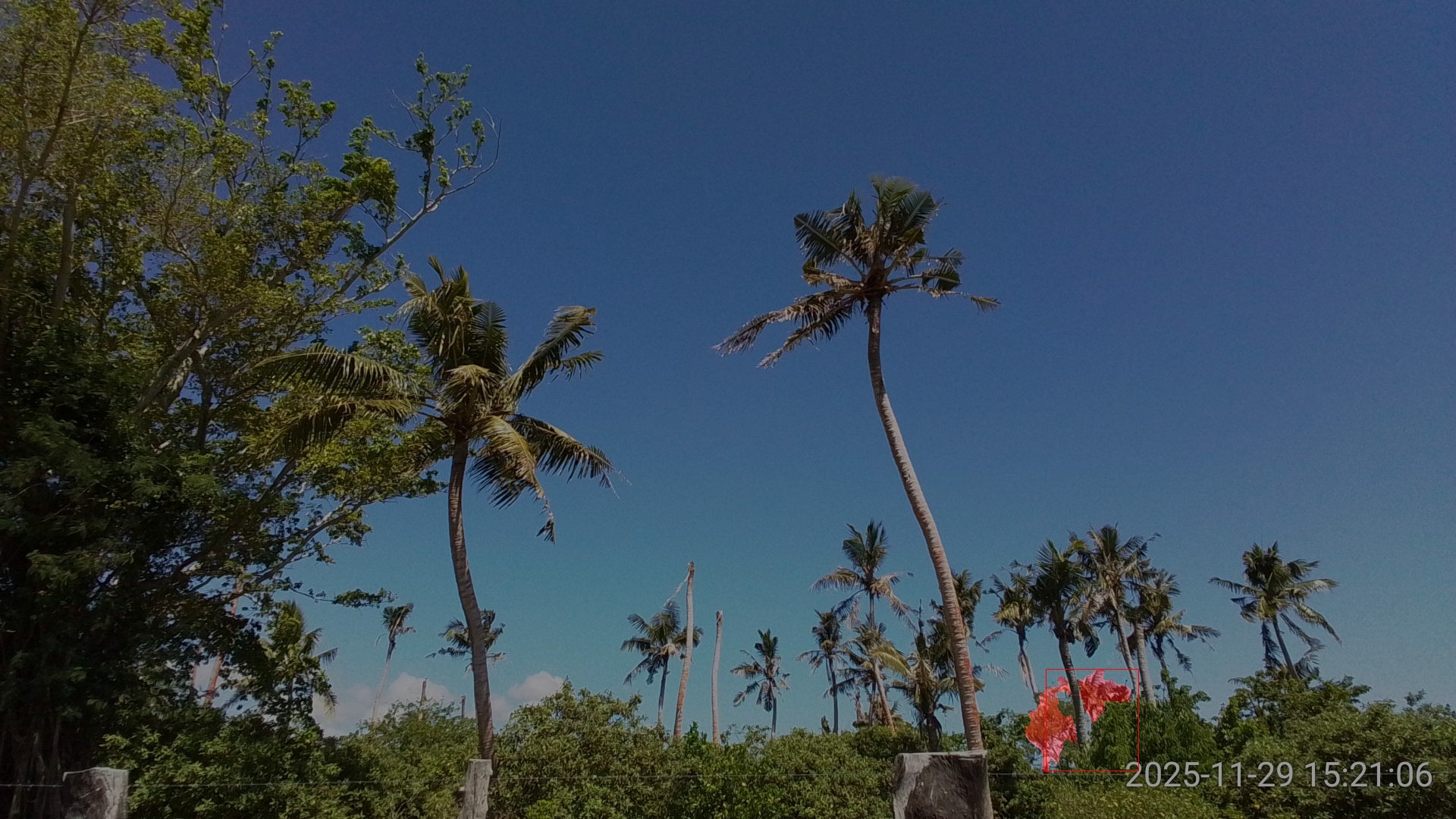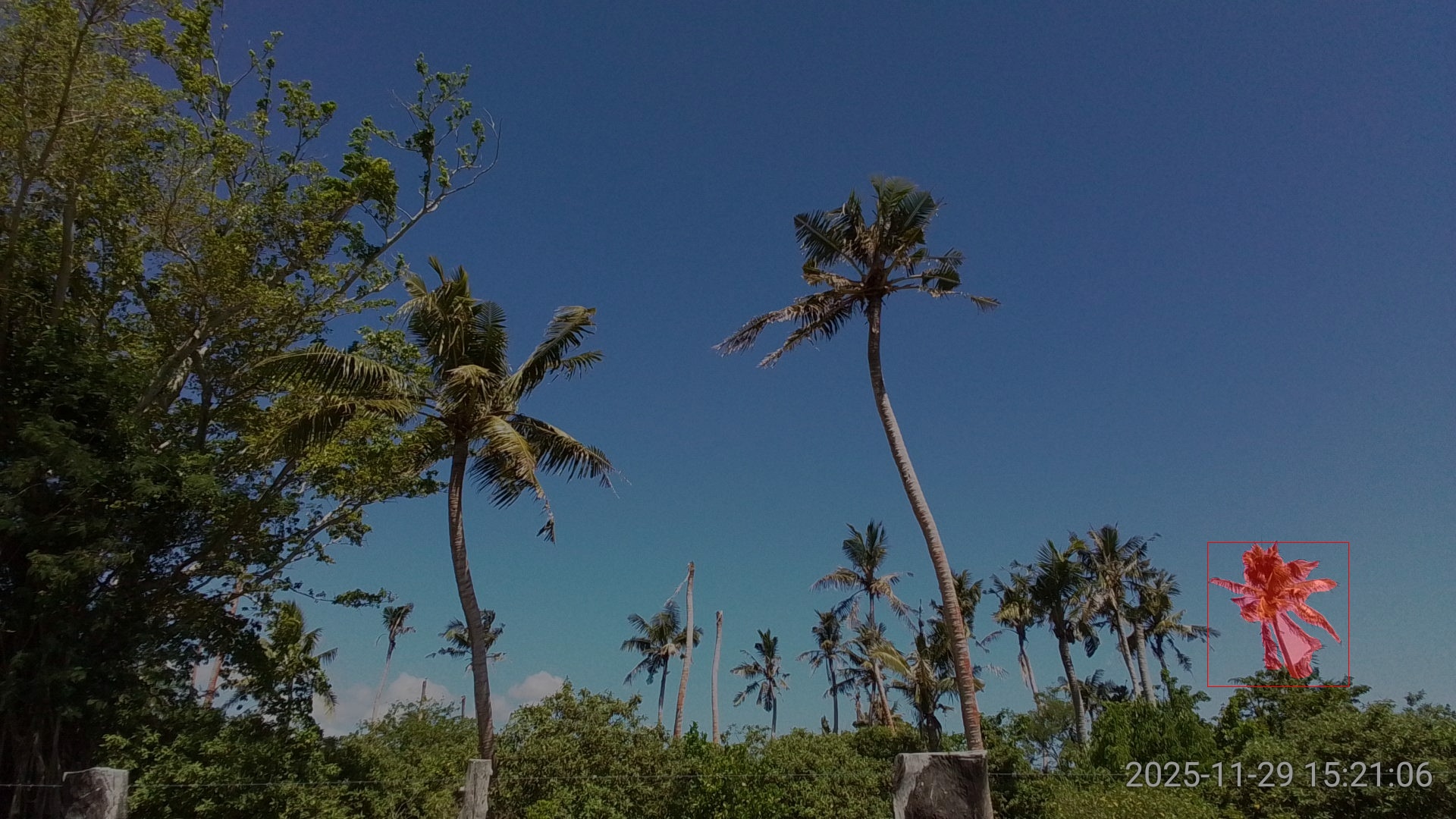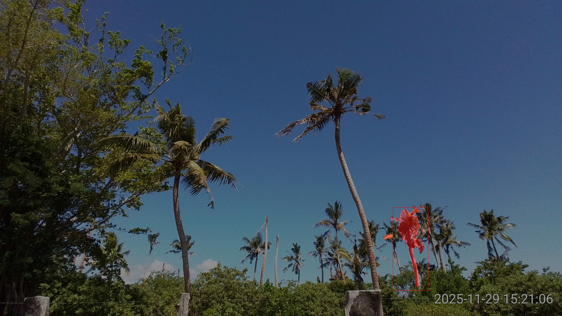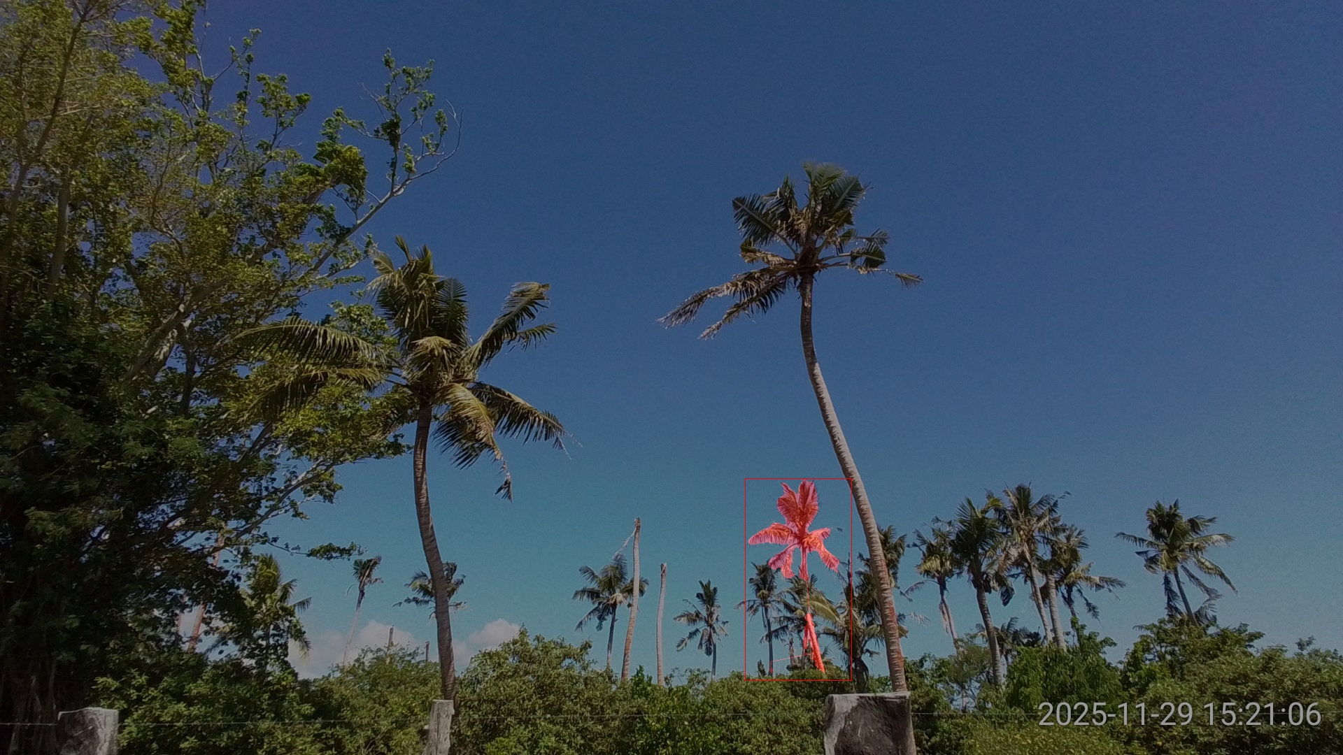 SAM3 performed very well on this image, returning high confidence detections and precise segmentation even tough the two coconut palms were heavily damaged (Figure 3).